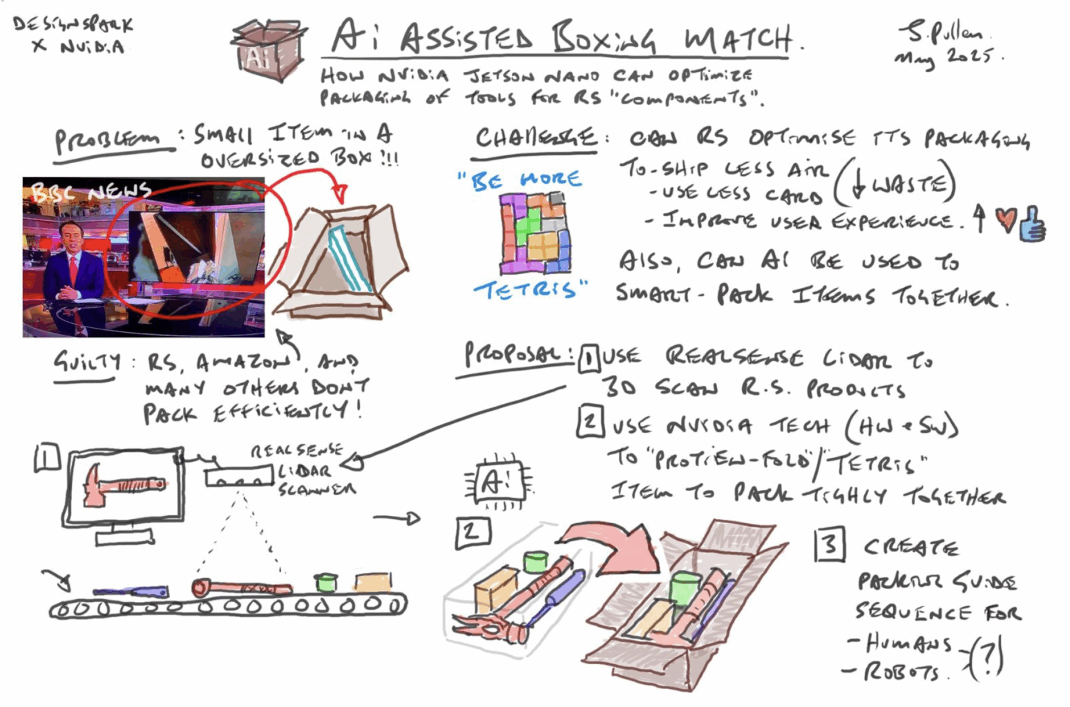 Some of Jude’s projects are particularly revealing of how design, logistics, and technical ingenuity intersect. At Dyson, there was  a brief asking whether a vacuum cleaner could fit onto the profile of an A3 sheet of paper. The challenge combined product design with shipping and logistics, forcing innovative thinking about telescopic handles, modular sections, and avoiding “wonky or overly elaborate” mechanisms. Similarly, at RS, he explored how automated packing equipment could be paired with subtle behavioural nudges – such as small discounts or visual cues – to reduce waste and improve efficiency without overcomplicating operations. These are explored in his 6-part blog series for RS and NVIDIA, on RS DesignSpark (Search “Jude Pullen”).